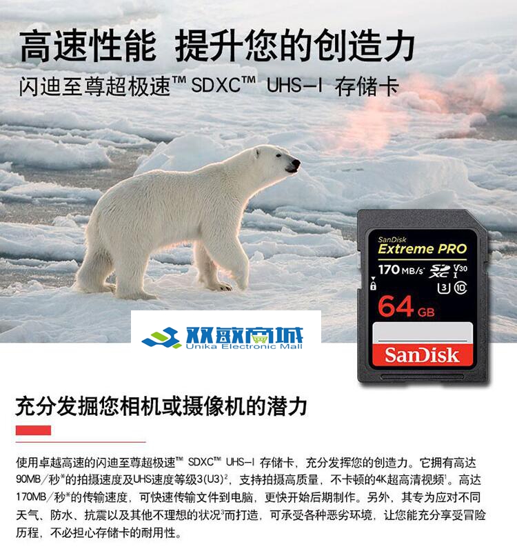 | 商品名称 | 闪迪 64GB SD存储卡 U3 C10 V30 4K 至尊超极速版 读速170MB/s 写速90MB/s 4K超高清 |